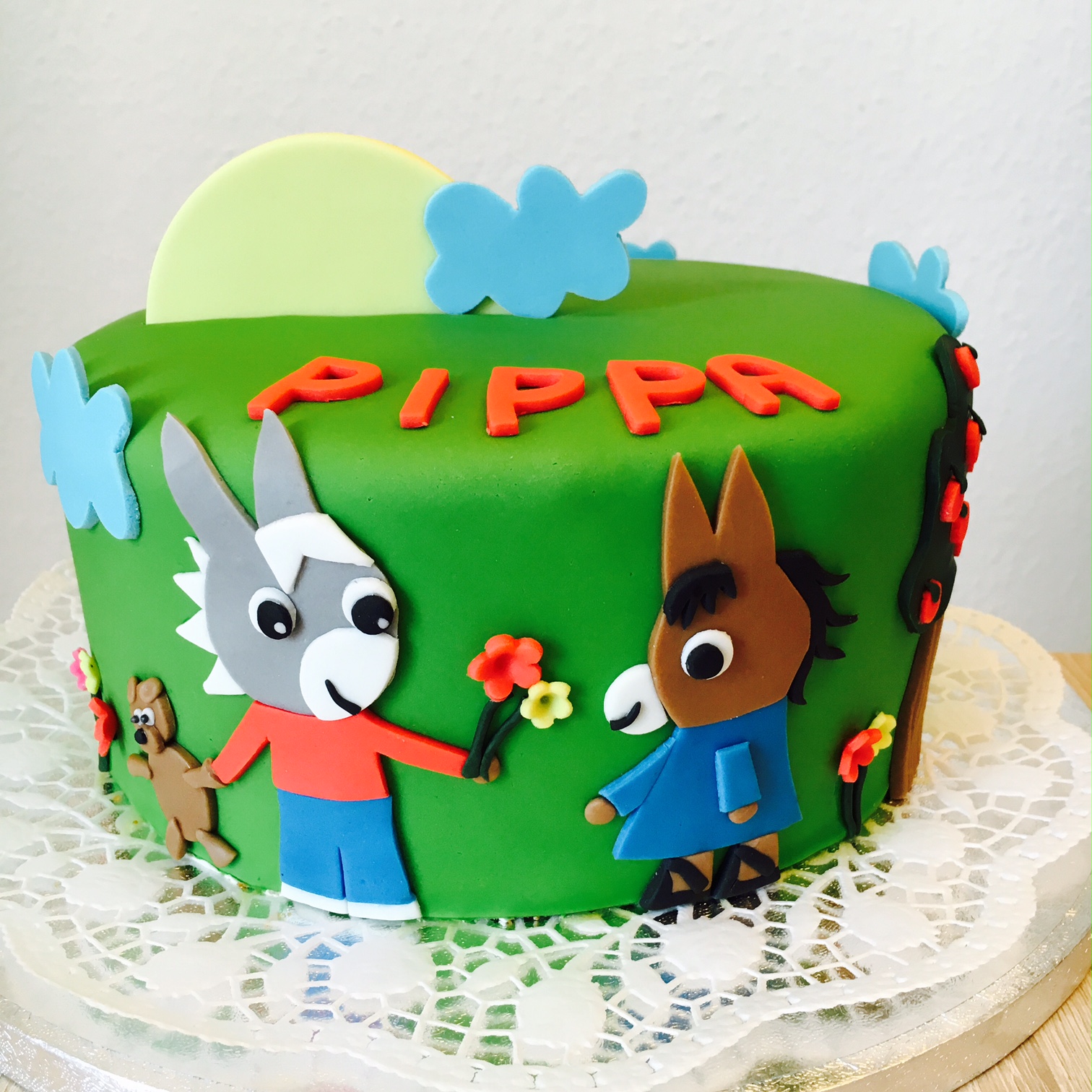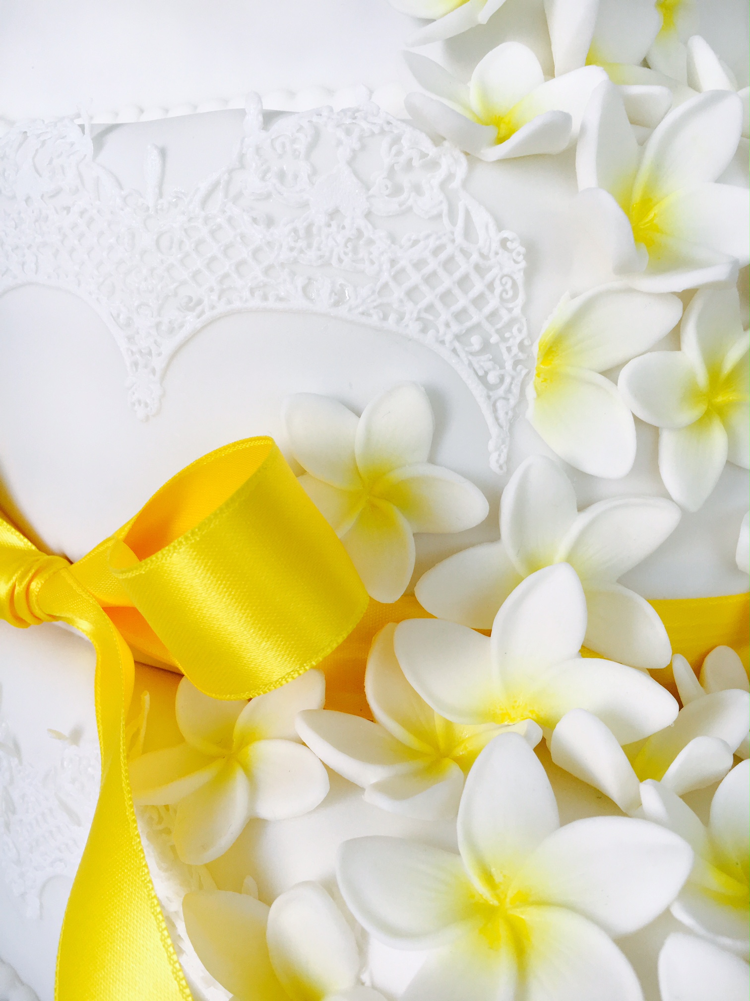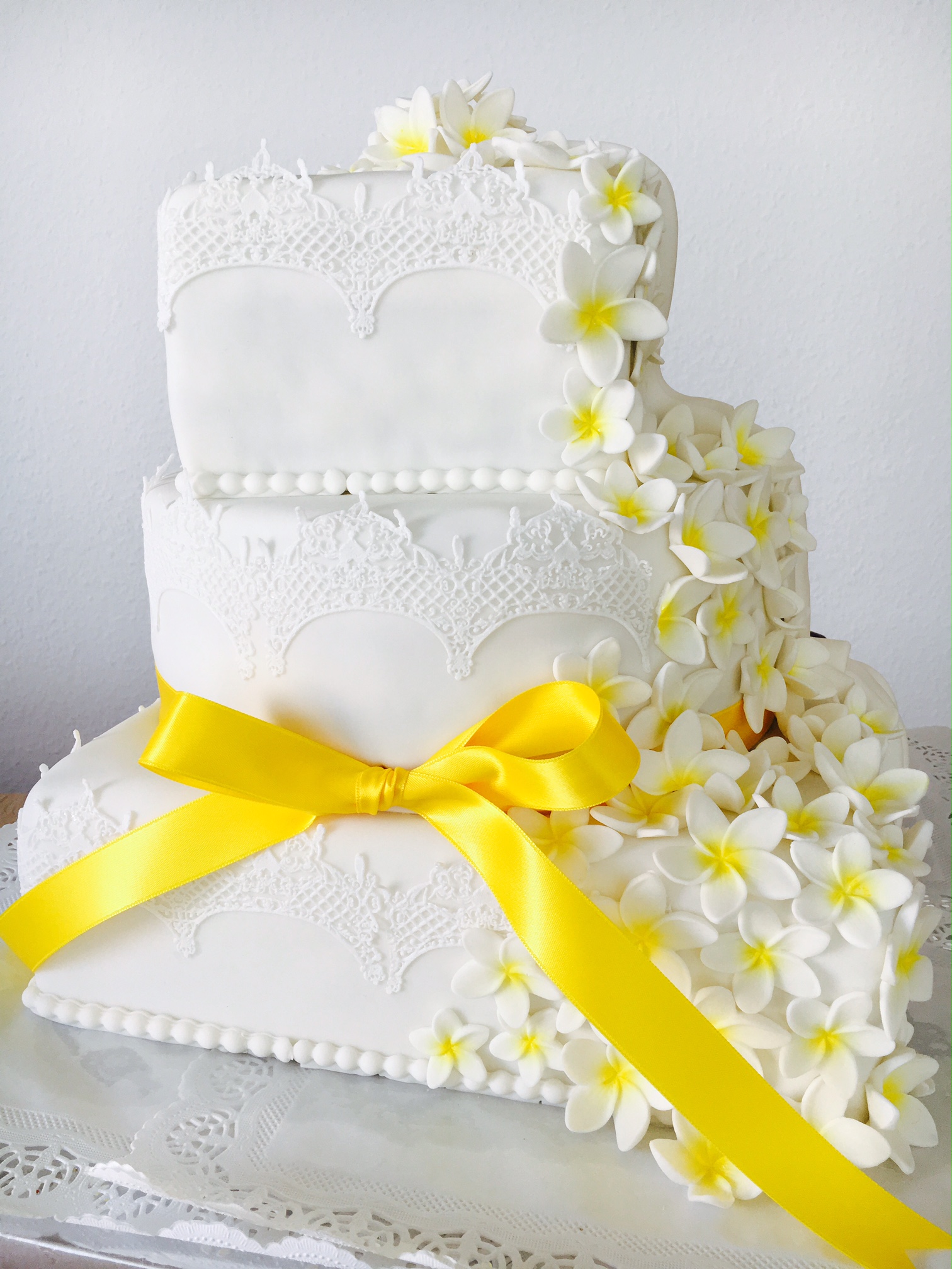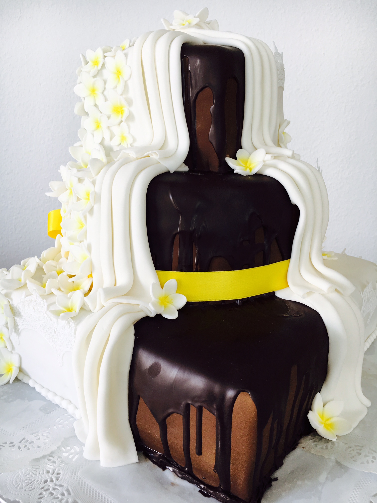 Dekoriert mit Magic Decor Tortenspitze, handmodellierten Frangipani-Blüten. Two Face: hinten öffnet sich der "Vorhang" und zeigt eine zweite Tortendeko. |