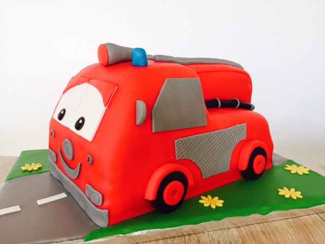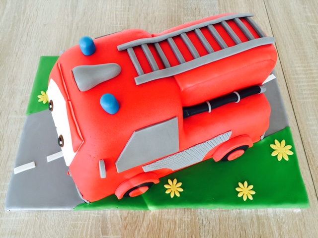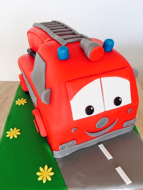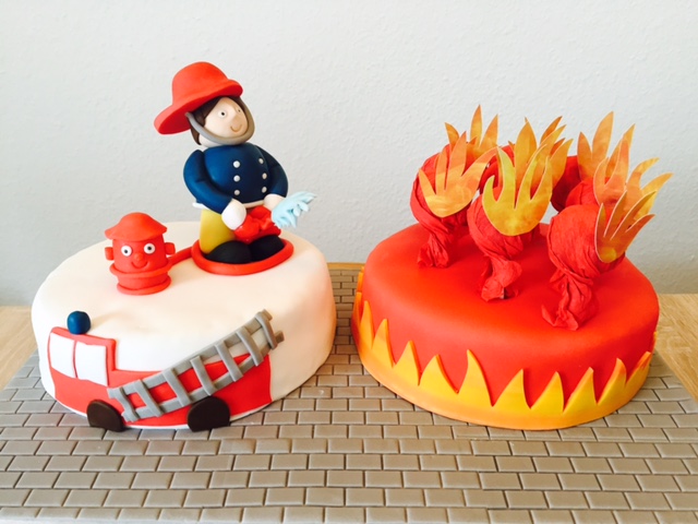Feuerwehrtorte mit Feuerwehrmann, Hydrant und "brennenden" Feuerlutschern |